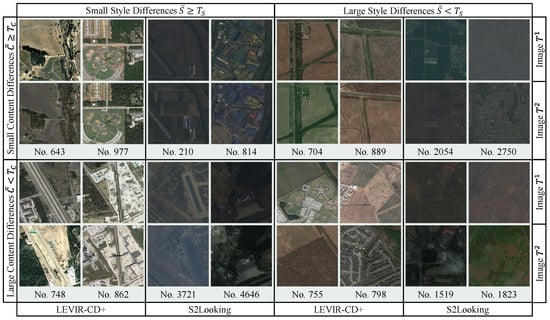 Figure 8 visualizes our visual style error validation method across content and style difference dimensions, using uniformly sampled examples. Based on the magnitude of these differences (large or small), we categorize them into four scenarios: small content/small style, small content/large style, large content/small style, and large content/large style. Visual comparison reveals that large content differences generally exhibit localized semantic variations (e.g., vegetation transforming into bare land, changes in building surroundings, uninteresting changes like parking lots). Conversely, large style differences tend to exhibit image-wide inconsistencies in radiation, weather, and phenology. Consequently, subsets exhibiting both large content and large style differences can be effectively identified. This method effectively partitions a CD dataset into two subsets for validating visual style errors, providing a quantifiable representation of this problem.