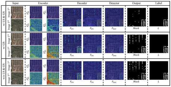 As illustrated in Figure 9, we employ a feature visualization technique—Gradient weighted Class Activation Mapping (GradCAM++) [44]—to perform an interpretability analysis of the features during the change detection process in RCCD. We compare the feature visualizations under three conditions: with the representation consistency learning module (w/LS and GS), with only the GS module (w/GS), and without any representation consistency learning modules (w/o LS and GS). The model with the representation consistency deep supervision module demonstrates stable feature responses throughout both the encoding and decoding stages—the heatmaps exhibit more uniform intensities and do not fluctuate dramatically despite variations in the visual styles of the input images. A similar global stabilization effect can be observed in the second row: with the addition of the GS module, the perceived activation distribution in the heatmap becomes even more uniform. In the first row, we observe that, compared to the second row (which lacks the LS module), there is a more pronounced suppression of pseudo-changes in the target objects and adjacent background during the decoding process. This underscores the necessity of local spatial context measurement. In contrast, the third row—corresponding to the configuration without any representation consistency learning module—exhibits the highest number of false alarms and is more susceptible to interference from vegetation and shadows, resulting in aberrant heatmap activations. Overall, the feature visualizations obtained during the RCCD prediction process confirm that the LS module effectively measures the similarity between the target and its local spatial context to suppress false alarms, while the GS module plays a crucial role in globally stabilizing images with varied visual styles, thereby ensuring the construction of comparable features.