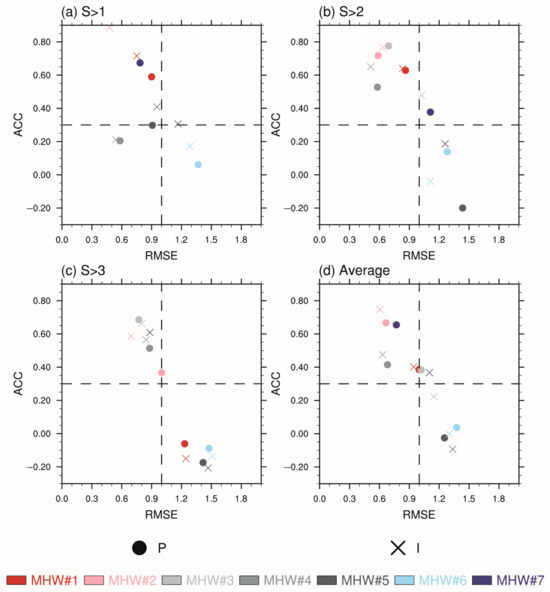 The anomaly correlation coefficient (ACC) and root mean square error (RMSE) skill of metrics corresponding to (a) S > 1 (PS>1 and IS>1, units: % and °CM km2), (b) S > 2 (PS>2 and IS>2, units: % and °CM km2), (c) S > 3 (PS>3 and IS>3, units: % and °CM km2), and (d) their averages based on the ensemble mean forecasts of the NUIST CFS1.1 model averaged in the period from 30 days before the onset to 30 days after the end of each MHW event. The red, pink, light gray, dark gray, black, light blue and blue dots represent the P parameter in MHW#1–7, respectively. The sign “×” with the above colors represents the I parameter in MHW#1–7. The black dashed lines represent the average ACCs and RMSEs for S > 1, S > 2, S > 3, and all metrics in MHW#1~7, respectively. If the symbol that represents an MHW event is located in the top-left corner, it signifies that MHW has an above-average ACC and a below-average RMSE, indicating better forecast skills. Oppositely, the symbols in the bottom-right corner indicate MHWs with poorer forecast skills.