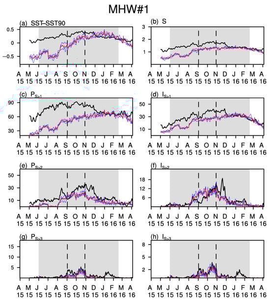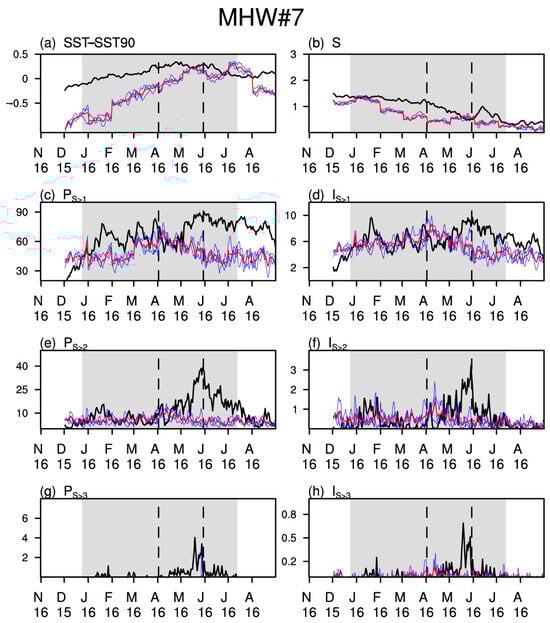 Similar to MHW#1 and #6, the MHW#7 event is related to the super El Niño in 2015/2016 winter but primarily occurs in spring and summer, post-El Niño. Notably, MHW#7 is located within the domain region of mega ENSO. MHW#7 shares many similarities with MHW#6, except for weaker SST-SST90 and S values, which are mostly smaller than 0.5 °C and 1.5 °C, respectively (Figure 5a,b). However, the observed IS>1 and IS>2 magnitudes are larger (Figure 5d,f) and there are more pronounced short-term fluctuations in all metrics except S and SST-SST90 (Figure 5). The model underestimates the peaks of IS>1, IS>2, and IS>3 and introduces time shifts exceeding two months for all metrics except S, indicating poor forecasts of moderate, strong, and severe warming trends during MHW#7.