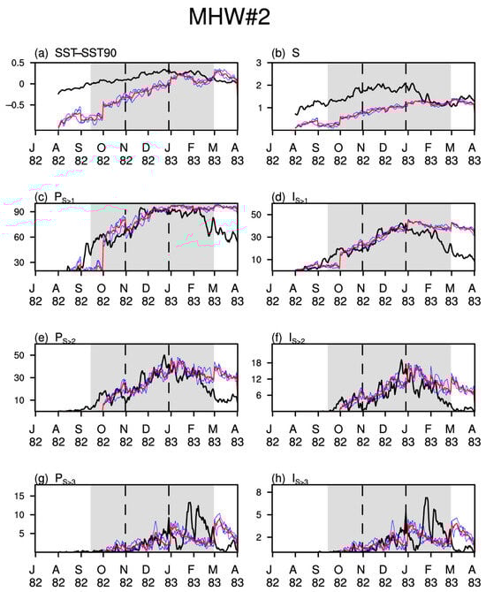 Both high-predictive events occurred during the eastern-type super El Niño periods (i.e., the winters of 2015/2016 and 1982/1983), primarily within the key area of El Niño region (Table 2). The MHW#1 lasts for 260 days and is characterized by large-scale moderate and strong warming. In particular, the proportion of the region experiencing moderate warming (PS>1) is up to 90% and the proportion with strong warming (PS>2) is up to 30% (Figure 2c,e). Additionally, the S index, averaged over all grid points where the occurring MHW remained above 1, indicate moderate to strong warming in the MHW#1 region (Figure 2b). The key metrics, including IS>1, PS>2, and IS>2, exhibit an upward trend from September to December 2015 (Figure 2d–f), with the proportion and intensity with extreme warming (PS>3 and IS>3) peaking during this period (Figure 2g,h). The MHW#2 event, which lasts for 167 days, shows similar observational features to MHW#1, except that there is a secondary surge in PS>2, IS>2, PS>3, and IS>3 from January to March in 1983, which is most pronounced in PS>3 and IS>3 (Figure 3).