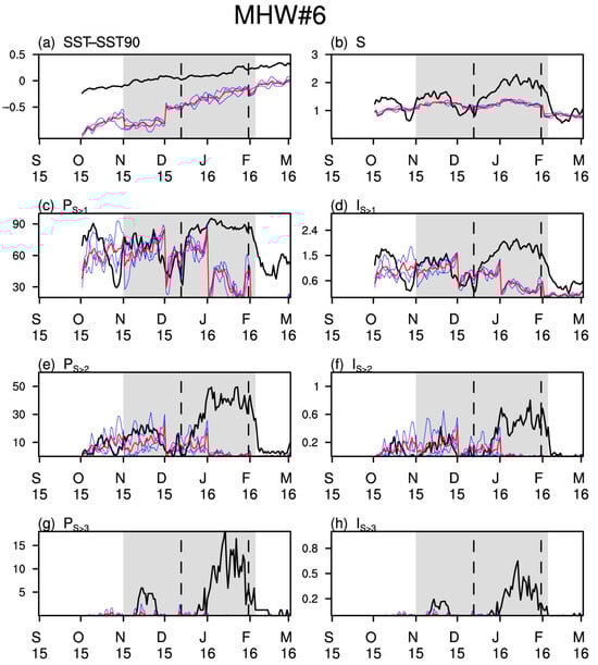 As in Figure 2, the time series of MHW metrics including (a) the difference between the regional average SST and 90th SST (units: °C), (b) the regional mean S index, and metrics (c) PS>1 (units: %), (d) IS>1 (units: °CM km2), (e) PS>2 (units: %), (f) IS>2 (units: °CM km2), (g) PS>3 (units: %), and (h) IS>3 (units: °CM km2), which are derived from observations (black bold curves) and 30–60 d fore-casts (red curves represent the ensemble mean forecasts, and blue curves represent forecasts of members with different nudging coefficient in SST) by the NUIST CFS1.1 model during the period but for the event MHW#6.