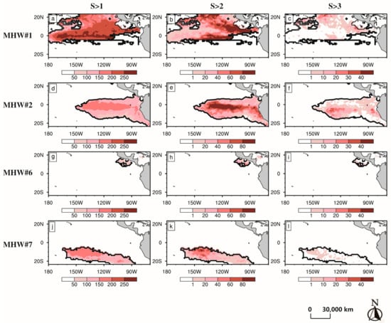 The spatial distribution of grids reaching the standard of moderate, strong, and severe warming (i.e., S > 1, S > 2, and S > 3) during the rapid warming period for MHW#1 (a–c), MHW#2 (d–f), MHW#6 (g–i), and MHW#7 (j–l), respectively.