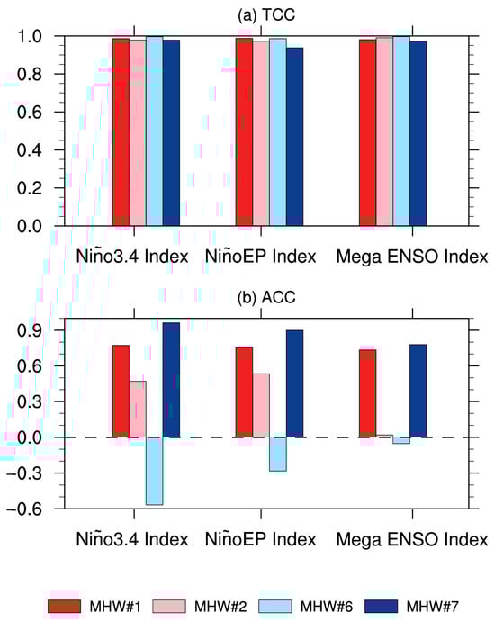 All four MHWs occurred during a super El Niño. Prior studies have emphasized enhanced predictability of longer-duration MHWs in the eastern Pacific [14,54]. Additionally, forecasts initialized during boreal spring or during active ENSO phases tend to be more skillful, with notable improvements in central–eastern Pacific seasonal forecasts [71]. Compared to traditional ENSO indices, “mega ENSO” captures a broader range of SST variability [72]. In our study, MHW#1–2 occurred within the key area of ENSO, and MHW#6–7 occurred at the periphery and within the domain region of mega ENSO. Thus, we first examine whether ENSO forcing exhibits distinct forecast skill disparities between high- and low-predictive MHW events. To do this, we select the Niño 3.4 index, Eastern type El Niño index (NiñoEP index), and mega ENSO index for further evaluation [72,73,74,75]. The ACC and RMSE for ENSO indices are calculated based on the observed and forecast time series in the period from 30 days before the onset to 30 days after the end of each MHW event.