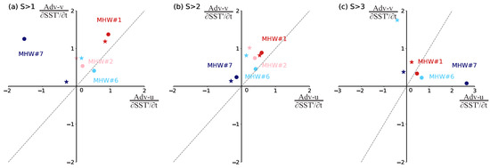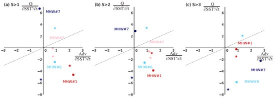 The contribution rates of Q and Adv to the SST tendency term during the rapid warming periods for moderate warming (S > 1) and strong warming (S > 2) are shown in Figure 9a,b, respectively. Notably, exhibits consistently positive values or Adv term makes substantial contributions to warming during MHW#1, #2, and #6, whereas is largely negative or the Q term largely contributes negatively. An exception is found in MHW#7. This suggests that the intensified horizontal heat convergence at sea surface is the primary driver of moderate and strong warming in MHW#1, #2, and #6, whereas in MHW#7, the strengthened air–sea heat fluxes from the atmosphere into the ocean are responsible. For the severe warming (S > 3), Adv’s positive contributions persist across all MHW events except MHW#2 (Figure 9c), where insufficient grids reach S > 3 and therefore not considered. It emerges that Adv predominantly governs moderate, strong, and severe warming in MHW#1–2 and MHW#6, except in MHW#7, where Q drives moderate and strong warming. This aligns with the prior research consensus that horizontal heat convergence is the main driver of MHW onset in 78% of global MHWs [23,76]. Notably, within the specific domains where MHW#1–2 and MHW#6–7 have been observed, these studies have highlighted that the contribution of Adv significantly surpasses that of Q in the warming process, with numerous grid points even exhibiting a negative contribution from Q.