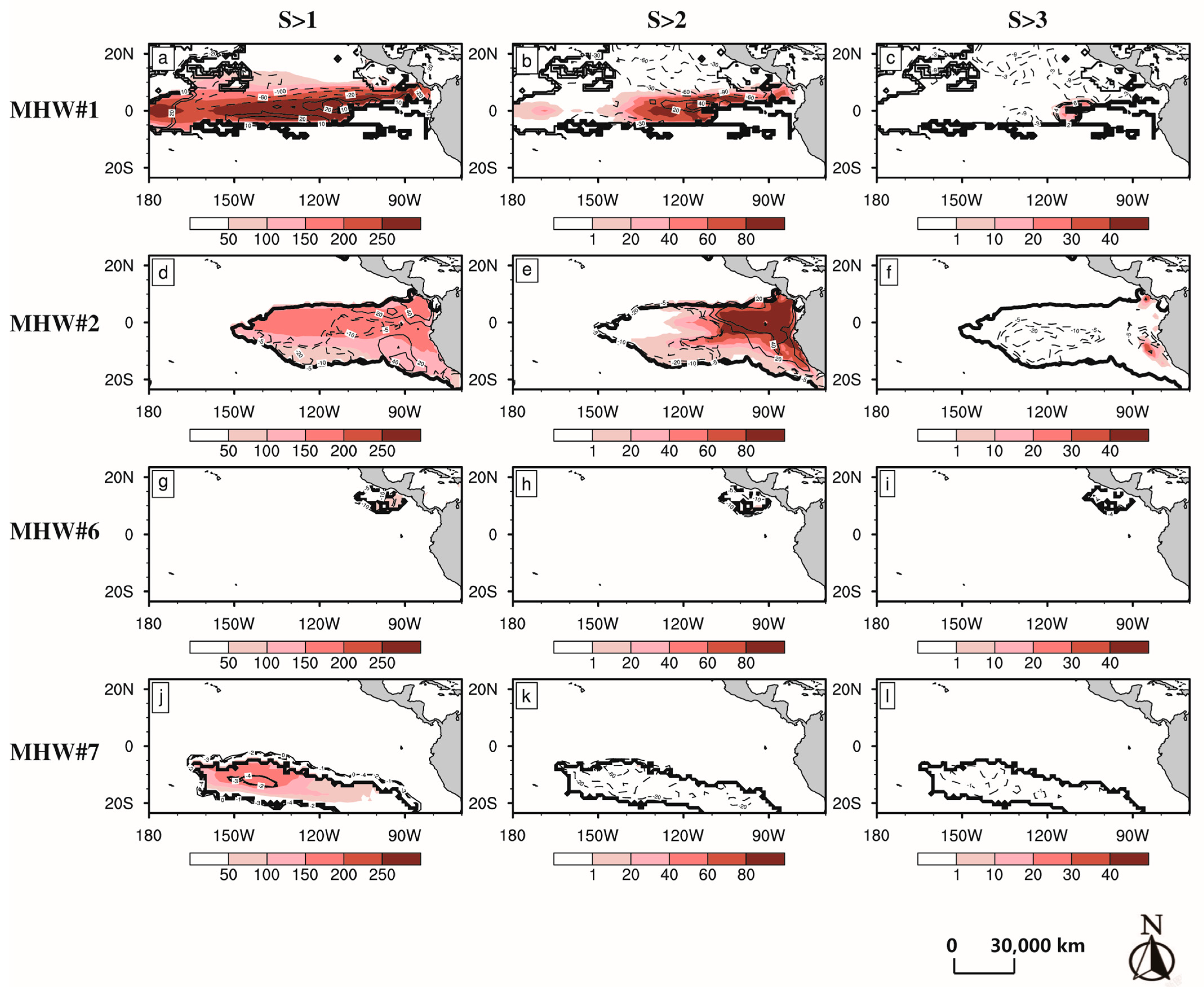 The spatial distribution of DS>1, DS>2, and DS>3 (units: days) derived from observations for MHW#1 (a–c), MHW#2 (d–f), MHW#6 (g–i), and MHW#7 (j–l), respectively. The black contour lines show the spatial extent of the occurrence of MHW#1, #2, #6, and #7, which is selected based on the maximum yearly mean SSTA from 1983 to 2020, strictly following Lin et al. [49].