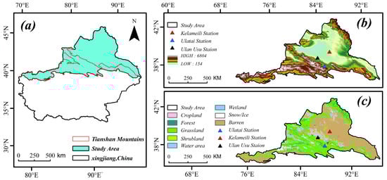 Xinjiang is a climate-sensitive arid region located deep inland in northwest China. Surrounded by mountains and basins, it is the largest autonomous region in China [25] (Figure 1a). The annual average Temperature Vegetation Dryness Index in the region is 0.75 [26]. The unique topography and climate features of this administrative region are shaped by the Tianshan Mountains (TM) located in its central part (Figure 1b). The region’s rivers and lakes mainly originate from glacial melt. It has scarce rainfall and significant temperature differences between hot and cold periods. The administrative region primarily consists of unused land and its ecosystem is fragile, with underlying surfaces such as desert vegetation, desert—oasis transition zones—farmland, and grassland/meadow (Figure 1c).