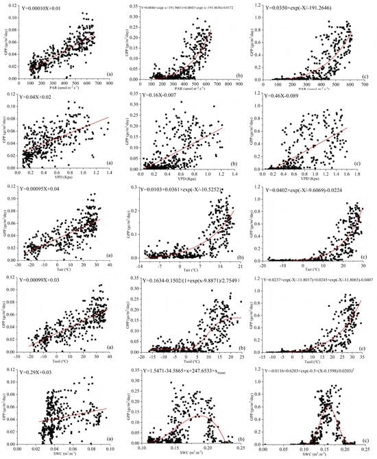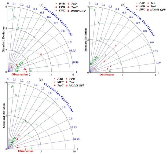 Figure 10. The expression pattern of the comprehensive impact of five environmental factors (PAR, VPD, SWC, Tair, and Tsoil) on GPP in different ecosystems. (a) Farmland areas. (b) Grassland areas. (c) Desert vegetation areas.