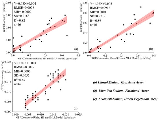 In addition, for the three underlying surfaces, the range of RMSE after fitting the measured GPP and the inverted GPP is between 0.0029 and 0.0916, the range of SD is between 0.0052 and 0.2712, and the range of MB is between −0.0002 and 0.0003. This further demonstrates the good applicability of the MLR model in GPP inversion in arid regions.
