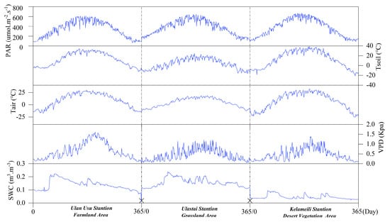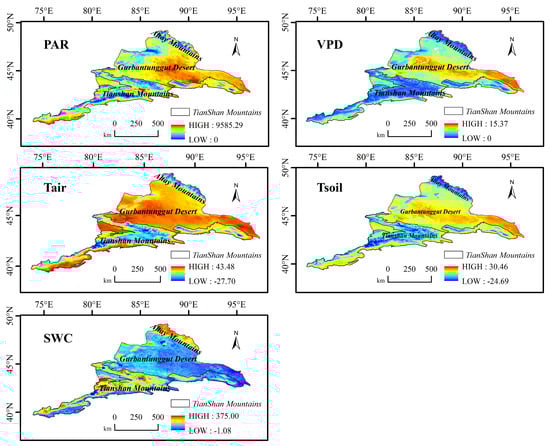 Figure 6. Annual spatial characteristics of five environmental factors (PAR, VPD, SWC, Tair, and Tsoil). The satellite products representing the spatial characteristics of environmental factors are derived from the comprehensive research findings of other scholars. Their applicability is evaluated in Figure 2.