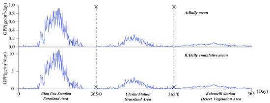 Figure 5. Intra-annual variation characteristics of the daily average and daily cumulative average of GPP at each station.