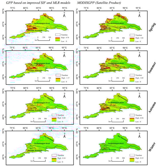 Figure 7. Comparison of seasonal average annual spatial variation characteristics of MODIS GPP and GPP (based on improved SIF and MLR model inversion). The applicability of the MLR model for GPP inversion is evaluated in Figure 3, and the applicability of MODIS GPP is evaluated in Figure 2.