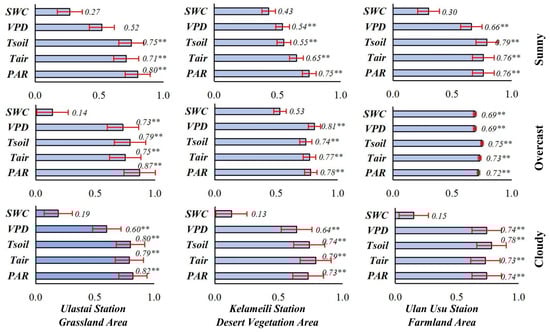 Figure 8. The correlation between GPP and five environmental factors (PAR, VPD, SWC, Tair, and Tsoil) under different weather conditions and underlying surfaces (** indicates passing the significance test of 0.05).