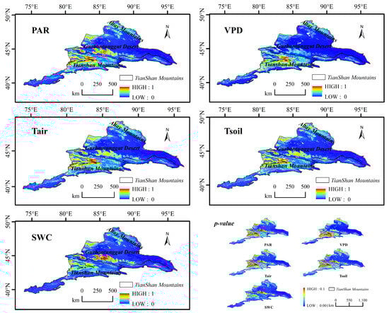 Figure 9. The spatial correlation changes between five environmental factors (PAR, VPD, SWC, Tair, and Tsoil) and GPP, where p-value is the significance test for the correlation coefficient.