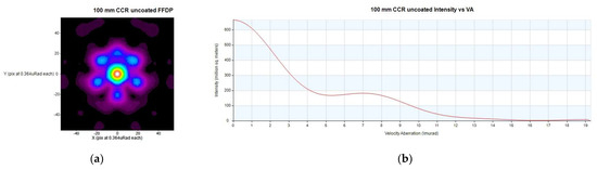 Simulated by CODEV software: (a) FFDP plane in pixels (conversion factor to μrad indicated in the labels of each axis); (b) average return intensity as a function of the VA.