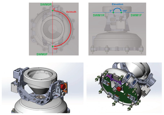 The ranges of rotations displayed in Figure 4 for Motor 0 (M0) and Motor 1 (M1), respectively, for azimuth and elevation, are determined by two limit switches (SW) per motor: