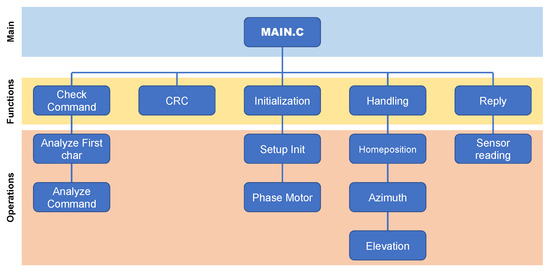 The MPAc software is written in C, and it is divided into main and five block functions (Check Command, Cyclic Redundancy Check (CRC), Initialization, Handling and Reply), which, in turn, are divided into sub-routines (Figure 5). The software is designed to perform operations only triggered from Earth, and the serial communication follows the RS-422 protocol with the following features: the data format uses 8 data bits, no parity, and 1 stop bit with a Baud rate of 115.2 kbps.