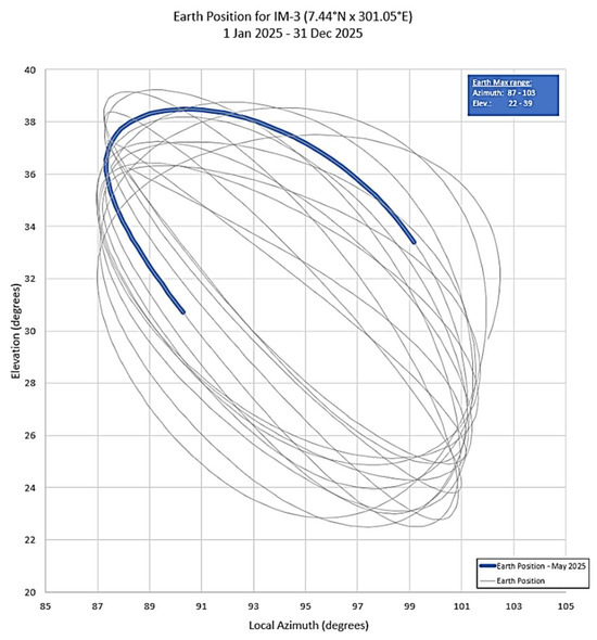 Earth libration pattern for IM-3 in the time frame 1st January–31st December 2025 (provided by IM). The NED is located at ≈94° in local azimuth and ≈31° in local elevation.
