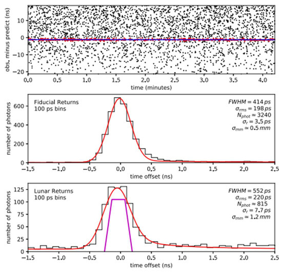The fitted line is subtracted from the residual signal to result in a new residual histogram. In order to fit this latest residual histogram, we assert that the lunar signal should be a combination of the fiducial signal profile (Figure 7, middle panel) with a trapezoidal array profile, which describes the array orientation at the time of ranging. A one-parameter fit is performed on the latest residual histogram by sliding the aggregate fiducial signal fit (red curve) horizontally, convolved with the trapezoidal array tilt profile at the time of ranging (magenta lines), to optimally align with the lunar histogram (Figure 7, bottom panel). During the fit: