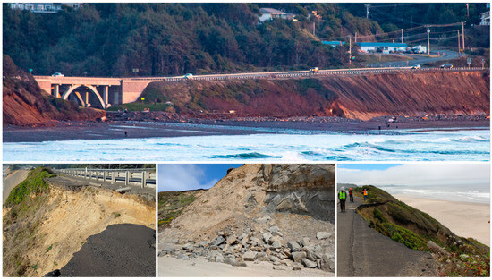 - Olsen, M.J.; Allan, J.; Dundas, S.; Krivova, M.; Leshchinsky, B.A.; Senogles, A.; Hermann, J.; Parrish, C.; Mackenzie, A.L. US Highway 101 Coastal Hazard Vulnerability and Risk Assessment for Mitigation Prioritization. Report FHWA-OR-RD-21-01. Available online: https://rosap.ntl.bts.gov/view/dot/73424 (accessed on 15 January 2025).