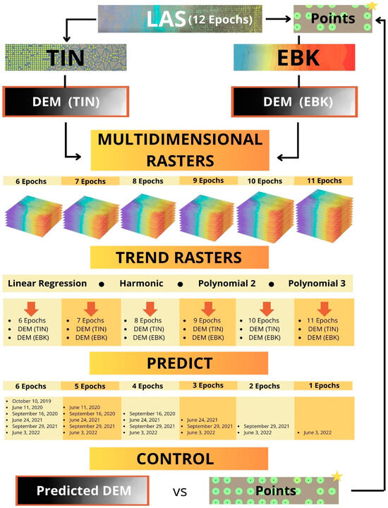 In this study, methods for converting point cloud data into raster formats were investigated, with a focus on deriving DEMs using TIN and EBK approaches. Cross-validation techniques were used to assess the surface modeling accuracy of EBK. Several raster combinations were applied to create multidimensional raster datasets, starting with the first 6 out of 12 epochs and incrementally including up to 11 out of 12 epochs, to forecast the subsequent epochs.