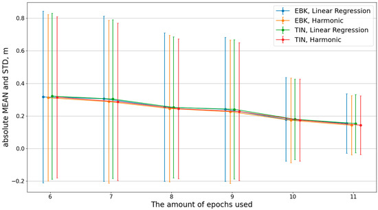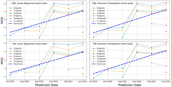 In analyzing the 168 combinations of forecasted DEMs, several trends in data processing were observed. Firstly, the greater the number of epochs used for prediction, the more accurate the predicted raster is (indicated by lower residuals). This tendency holds true across all interpolation types (linear, harmonic, polynomial) and both methods chosen for DEM derivation (EBK, TIN), as shown in Table 3 and Table 4. Similarly, the longer the time period between the epochs used for prediction and the forecasted epoch, the less accurate the result becomes (Figure 5). For example, eight epochs (ranging from 20 September 2016 to 11 June 2020) were used to predict four epochs: 16 September 2020; 24 June 2021; 29 September 2021; and 3 June 2022 (depicted by a green line), where residuals increase as the time gap widens.