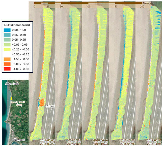 Several studies (e.g., [22,23,24,25,26,27]) have been conducted to examine the dynamic changes occurring along the Oregon coast, including Beverly Beach. Among these, one notable study by Allan et al. [22] utilized a combination of early topographic “T” sheets, orthorectified imagery from different time periods, GPS measurements, and lidar data. They observed that the Oregon shoreline is highly sensitive to variations in ocean water levels and episodic storm events, making it challenging to determine erosion rates through simple linear regressions or endpoint rate calculations.