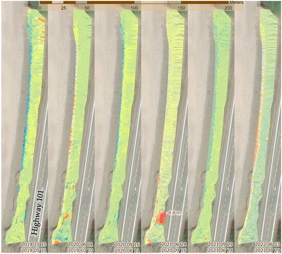 During the period from 2016 to 2022, terrestrial lidar surveys were conducted along Beverly Beach twice a year in order to capture the seasonality of erosional processes, resulting in a total of 12 surveys. The data were accumulated using a variety of terrestrial lidar scanners (Reigl VZ-400, Riegl Laser Measurement Systems GmbH, Horn, Austria and Leica Scanstation P50, Leica Geosystems, Heerrbrugg, Switzerland), with a target resolution of approximately 5 cm on the sea cliff. In addition to the laser scanner, a GNSS receiver (Leica GS14) was employed to record location coordinates during the scanning process. Data collection points were strategically situated along the Pacific Ocean shoreline at intervals of 30–40 m and a similar distance from the sea cliff based on the recommended procedures of Olsen et al. [36]. Despite the considerable width of Beverly Beach, data collection was primarily timed to coincide with periods of low tides. Scanning parameters such as resolution, scan angle, and rate were configured, along with necessary environmental corrections. Subsequently, the scans were georeferenced using the methodology outlined in Olsen et al. [36,37], utilizing a combination of GNSS coordinates for the scan origin, inertial sensors for leveling information, and point cloud surface matching.