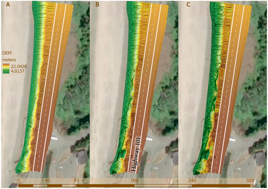 Based on the four optimal methods described above, the extrapolation has been conducted for 2025, 2035, and 2050, not only focusing on the cliff area but also including a section of the highway (Figure 8). Significant erosion is expected in this area, with notable encroachment onto the road pavement, particularly in the southern part of the area.
