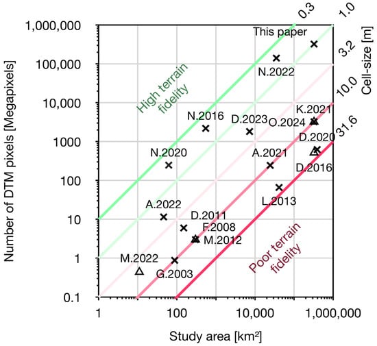 With today’s advances in computing capacities and with the increase availability of DTMs, regional assessments can now benefit from increased DTM’s fidelity and cover wider areas. However, increasing both the study area and the level of detail of the DTM comes at the cost of increasing the computational complexity. For context, it can thus be interesting to express the studies from Table 1 in terms of covered area and the amount of DTM information (number of pixels) considered (Figure 1). Moving up vertically in Figure 1, the computational complexity increases in orders of magnitude. For example, utilizing a DTM from an airborne LiDAR survey (ALS) over the Yosemite Valley, Noël et al. []’s revisit of Guzzetti et al. []’s novel work considers more elevation terrain data by approximately two and a half orders of magnitude. For similar increased computational complexity, one can alternatively cover a wider study area with limited terrain fidelity, like the remarkable work from Dupire et al. [] covering the whole Alpine Region with nearly 50 billion simulated trajectories. One thus realizes the challenge associated with covering vast study areas while utilizing detailed terrain models. But doing so can be rewarding if the potential gain in predictive accuracy can help reduce the societal land use constraints of the resulting hazard zonation while preserving or enhancing the public safety.