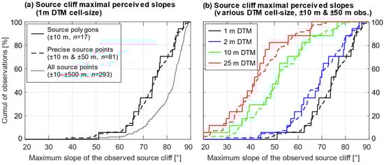 Effect of the loss of precision on the interpretations related to the rockfall sources when using coarser DTMs. At a cell size of 1 m, most mapped sources have a cliff steeper than 50° in their vicinity. With coarse DTMs, the cumulative curves are artificially shifted toward gentler maximal slopes.