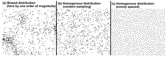 Conceptual representation of the possible source distribution spatial bias and correcting strategies. One thousand points are shown in each example square. The squares thus represent about 120 × 120 m of cliff surface for the chosen number of simulated trajectories per cliff surface of this application case.