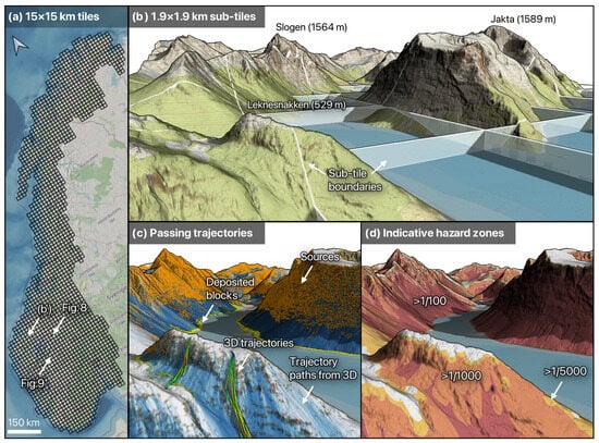 Overview of the study area and the intermediate states of the methodology, visualized in QGIS. The national 1 m DTM is subdivided into 2033 15 × 15 km tiles (a). An area of about half of one 15 × 15 km tile is shown in (b), subdivided into 35 1.9 × 1.9 km sub-tiles (out of 64 per tile). The sources shown in orange in (c) are distributed proportionally to the cliff surfaces. The 3D-simulated trajectories and their resulting rasterized paths pass seamlessly across sub-tile boundaries. This way, the temporal information is seamlessly distributed spatially following realistic possible rockfall propagations. The rockfall hazard was estimated locally with moving averages using a circular floating window of the size of hypothetical exposed objects. The indicative hazard zones (d) were produced for the boundaries of the hypothetical objects. Elevation and imagery data in (a) are from the ©Mapzen (MIT license) and ©OpenStreetMap contributors (ODbL license), respectively. Elevation and imagery data in (b–d) are from ©hoydedata.no and ©norgeskart.no, respectively (both with a Norwegian license for open government data—NLOD license). EPSG: 25833.