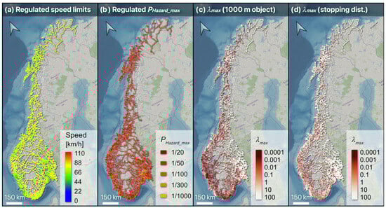 Qualitative overview of the considered portion of the Norwegian road network (county and national roads). Attributed information such as the speed limits and regulated PHazard_max threshold based on the yearly averaged daily traffic volume (AADT) is shown in (a,b). Since λ is subject to change based on local conditions, the results were also expressed in terms of the local maximal tolerable frequency of block fragments (λmax). The obtained λmax values are shown in (c,d) for an exposed object length of 1000 m and for a vehicle length combined with its stopping distance, respectively. Elevation, imagery, and road network data are from the ©Mapzen (MIT license) and ©OpenStreetMap contributors (ODbL license) and ©vegdata.no (NLOD license), respectively. EPSG: 25833.