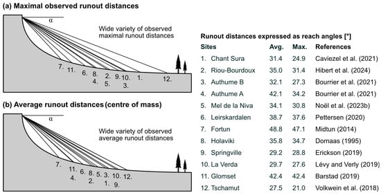 Compiled overview of precisely mapped average and maximal runout distances for several rockfall events and experiments with known source heights. Given the wide range of site geometries and scales, the data are shown in terms of reach angles (source-rock line-of-sight) over a hypothetical slope profile for comparison purposes. Note the wide variety of observed maximal runout distances (a) around a median value of 31.1°, or (b), around a median of 34.6° for the average runout distances (center of mass of the mapped deposits). (Mapped data from: Caviezel et al. []; Hibert et al. []; Bourrier et al. []; Noël et al. []; Pettersen []; Midtun []; Domaas []; Erickson []; Lévy and Verly []; Barstad []; Volkwein et al. []).