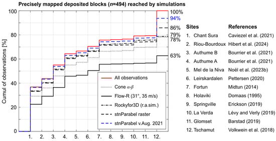 Cumulative curves showing the ability of the simulations to properly reach the mapped deposited rock fragments for different sites. Perfect or over-conservative predictions would lay on the red curve. The further a cumulative curve deviates from the red one (observations), the more mapped rock fragments it misses due to predicting too short runout distances compared to the observations. (Mapped data from: Caviezel et al. []; Hibert et al. []; Bourrier et al. []; Noël et al. []; Pettersen []; Midtun []; Domaas []; Erickson []; Lévy and Verly []; Barstad, []; Volkwein et al. []).