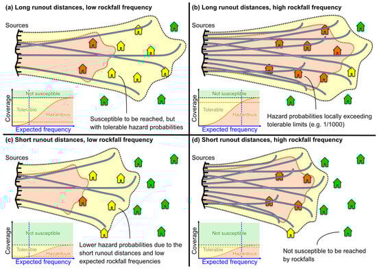 Several factors can affect the stability of rock compartments over time (Wyllie []). As non-exhaustive examples, local conditions such as a combination of joint sets with orientations related to the rock faces that ease rock compartments to slide out of the face or to topple away increase the likelihood of failure. In addition, low-friction infilling materials, smooth joint surfaces, high water pressures, trees and roots with jacking effects, frequent freezing, and thawing conditions can all exacerbate precarious stability conditions. A site whose rockfall source areas have marginal stability conditions should have high frequencies of rockfall failure events in comparison to sites with a similar amount of source areas but better stability conditions. Across the paper and for given source areas, the likelihood of failure in time is thus expressed as frequencies for the temporal hazard component.