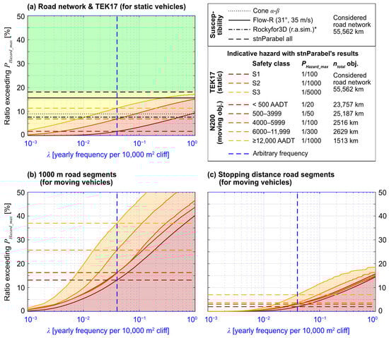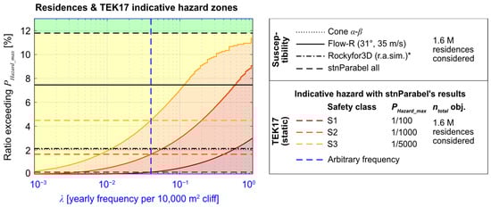 Finally, the λobject values were found locally using Equation (1) from the local nreach, the homogenous nsims of 714 per 10,000 m2, and the arbitrary λ of 1/25 per 10,000 m2. Guiding indicative hazard zones were drawn where the λobject values exceed λobject_max found with Equation (6) from the PHazard_max yearly nominal probability thresholds of 1/100, 1/1000, and 1/5000, based on TEK17 (Norwegian Building Authority []). For linear infrastructures, the PHazard_max yearly nominal probability thresholds of 1/20, 1/50, 1/100, 1/300, and 1/1000 based on N200:2022 (Norwegian Public Roads Administration []) were used. Since λ is subject to change based on local conditions affecting the likelihood of failure, the results were also expressed in terms of the local maximal tolerable frequency of block fragments (λmax) using Equation (7). This way, it would be easier during field inspections to evaluate locally if the regulated PHazard_max threshold is exceeded for custom locally estimated λ values instead of the arbitrary chosen one. For example, if the λ value locally estimated from a field inspection is higher than λmax, the local rockfall hazard exceeds the regulated PHazard_max threshold, assuming that the simulations locally reflect the field observations (which should also be verified during the field inspection).