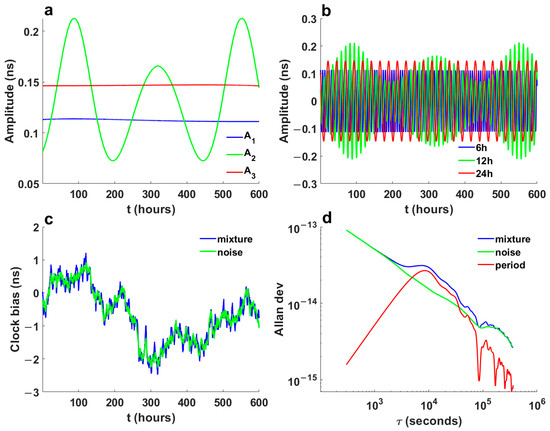 where the sampling interval is 1/12 h, and the total sampling duration is 600 h. The first three terms on the right side represent simulated 6 h, 12 h, and 24 h periodic signals, with their respective amplitudes , , and shown in Figure 1. The frequency of the 6 h periodic component gradually increases over time as defined in Equation (16), simulating real-world frequency fluctuations. In Figure 1a, represents the amplitude of the 12 h periodic component, which varies over time to model realistic amplitude fluctuations. The amplitude and frequency of the 24 h periodic component remain constant. The fourth term on the right side of the equation represents the noise component in the clock bias model, whose time-domain plot is shown in Figure 1c. The left side of the equation represents the mixed data, comprising superimposed periodic and noise terms, with its time-domain plot also shown in Figure 1c. As shown in Figure 1d, the Allan deviation was calculated for the mixed signal, noise-only, and periodic-only components at different averaging times to assess frequency stability. Observations indicate that the Allan deviation curve of the noise component remains smooth, showing no distinct peaks or fluctuations, confirming that it is unaffected by the periodic terms.