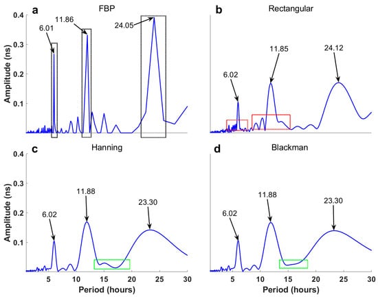 Figure 2c,d show the spectra produced using Hanning and Blackman windows, respectively. Both of these windows reduce spectral leakage from data truncation compared to the rectangular window. However, they also cause main lobe broadening. As shown in the green box in Figure 2c,d, the Blackman window suppresses sidelobes more effectively than the Hanning window, though it further broadens the main lobe. The arrows in Figure 2c,d indicate that the peak frequency of the 24 h periodic term shifts to 1/23.30 h−1, showing a greater deviation from the true frequency than with the rectangular window. Consequently, window functions cannot entirely eliminate peak frequency shifts due to noise or spectral leakage from data truncation.