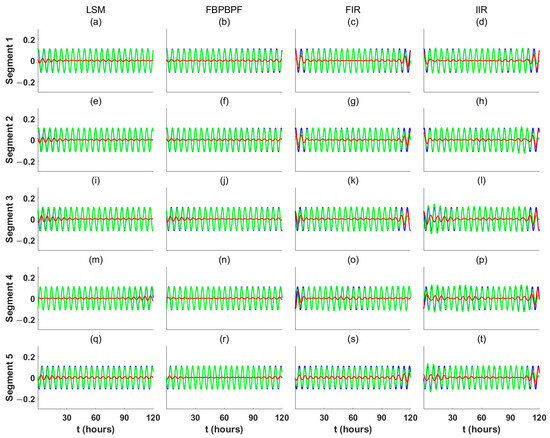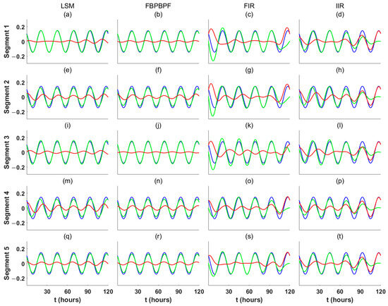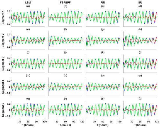 To validate the effectiveness of the extraction methods, the mixed signal m(t) was divided into five segments, each covering 120 h. Segment 1 covers 1–120 h, segment 2 covers 121–240 h, segment 3 covers 241–360 h, segment 4 covers 361–480 h, and segment 5 covers 481–600 h. The results of extracting periodic terms using the LSM, FBPBPF, FIR, and IIR are shown in Figure 3, Figure 4 and Figure 5. Zero-phase digital filtering was applied to both the FIR and IIR bandpass filters to avoid phase delays. In order to suppress noise and spectral leakage, the design of the filter focuses on the preservation of frequency components close to the main lobe. The FIR filter was designed with a Kaiser window, and the IIR filter was configured as a Butterworth filter, each with zero-phase filtering to maintain signal alignment and improve extraction accuracy across boundary and full-length signal regions [19,20,36]. In these figures, each row represents a simulated data segment, and each column corresponds to a different extraction method. The blue line represents the simulated periodic term from Equation (16), the green line represents the reconstructed periodic term for each method, and the red line represents the extraction residuals, which is the difference between the simulated and reconstructed periodic terms.