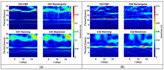 Figure 6a shows that the STFT based on a rectangular window exhibits significant spectral leakage, with large sidelobes causing false periodic terms and reducing the accuracy of periodic term identification. Figure 6a also shows that the use of Hanning and Blackman windows in the STFT effectively suppresses sidelobes, but this also broadens the main lobe, which reduces the frequency resolution in the time-frequency spectrogram. Compared to the rectangular, Hanning, and Blackman windows, the FBP significantly enhances the frequency resolution and sidelobe suppression in the STFT, thereby improving the clarity of the time-frequency spectrogram. For example, as shown in Figure 6b, the 20 h periodic term for C22 is clearly identified in the STFT based on FBP, while these terms cannot be effectively identified in the STFTs using rectangular, Hanning, or Blackman windows due to sidelobe interference and main-lobe broadening.