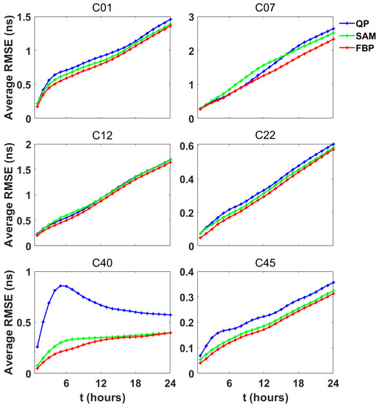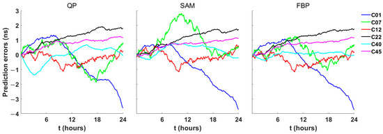 To validate the capability of the FBPBPF method in extracting periodic terms through simulation experiments, this study employs the QP prediction method, the SAM prediction method based on LSM and the FBP prediction method based on FBPBPF to predict the clock bias data of BDS satellites listed in Table 2. The specific steps are as follows: First, since extracting periodic terms with period of 24 h usually requires at least 48 h of data, in order to balance the accuracy and efficiency of clock bias prediction, 72 h of clock bias data is used to fit the prediction model, and the model is used to predict the clock bias for the next 24 h. Then, the prediction is continued for 25 days, and each time the predicted value is compared with the measured clock bias data and the root mean square error (RMSE) of the prediction error from 1 to 24 h per day is calculated. The prediction error on February 8, 2023, is shown in Figure 7. The average RMSE of the 1 to 24 h over the 25 predictions is shown in Figure 8. By comparing the prediction results of QP, SAM and FBP, the improvement in the prediction accuracy of the FBP prediction method at different time intervals (6 h, 12 h, 18 h and 24 h) is evaluated, as shown in Table 3.