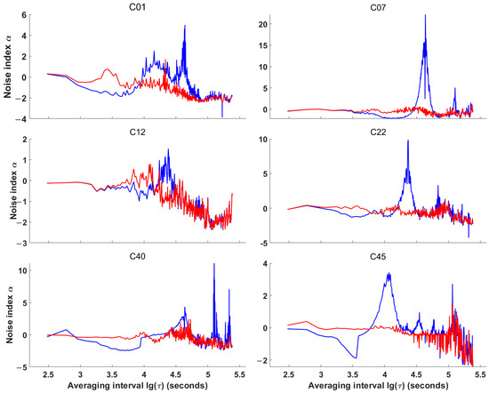 As shown in Figure 10, the noise type of the BDS satellite clock changes as the smoothing time increases. However, in general, the BDS satellite clock is mainly affected by white frequency modulation noise, flicker frequency modulation noise, and random walk frequency modulation noise. The BDS satellite clock before the periodic term is extracted has a large noise index in the smoothing time range of 5000 s to 50,000 s. The reason for the large fluctuations is that its clock bias data have a more pronounced periodicity. After the periodic term is eliminated using an FBPBPF, the abnormal fluctuations in the lag 1 ACF noise type in the longer smoothing time range are effectively suppressed, and its original noise characteristics are revealed.