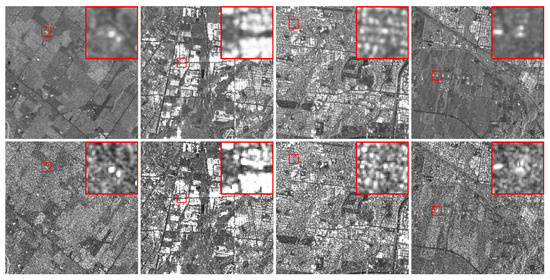 Four samples of images from the dataset. Top: Denoised reference images (ground truth). Bottom: Actual SAR with speckle (noisy). Zoom of regions of interest in red bounding boxes.