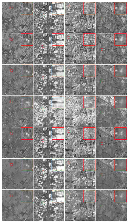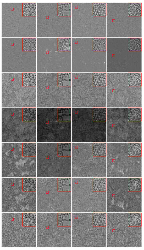 Four samples despeckled with different filters. From left to right: four samples of different locations. From top to bottom: Lee, FANS, AE, GenAE, GenU-Net, U-former, and Restormer. Zoom of regions of interest in red bounding boxes.