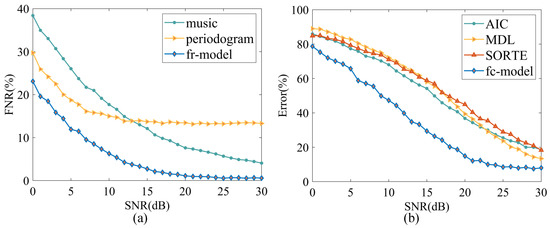 This paper validates, through Monte Carlo simulations, that the neural network-based model outperforms existing methods in error coefficient estimation. The accuracy of the estimate is measured by computing the False Negative Rate (FNR), which is defined as the number of true frequencies that go undetected, i.e., when no estimated frequency falls within a radius of . As shown in Figure 7a, it is evident that within the SNR range of 0–30 dB, the proposed frequency estimation module exhibits significant superiority over both the MUSIC algorithm [18] and the periodogram [17]. In this SNR range, the proposed method achieves lower estimation errors, demonstrating higher precision and stability.