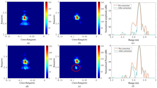 Next, in the same experimental scenario, a weak target was placed near the strong reflecting target. The resulting echo image is shown in Figure 10d. Due to the influence of periodic errors, it was difficult to discern the presence of the weak target in the scene. However, after eliminating the periodic errors using the proposed algorithm, as shown in Figure 10e, the weak target was clearly restored in the area marked by the red circle. The one-dimensional range profile in Figure 10f further illustrates this significant improvement.