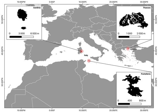 Our study was conducted in three Mediterranean insular regions (Figure 1): Sardinia, Thassos, and Pantelleria.