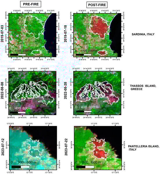 RGB composite image of burned areas based on CEMS outputs delimitation for each study area. Pre-fire Sentinel-2 imagery for Pantelleria shows a slight visual distortion, likely caused by thin cloud cover or minor atmospheric interference during image acquisition. While this can occasionally occur despite atmospheric correction processes, it does not affect the reliability of the subsequent analysis.